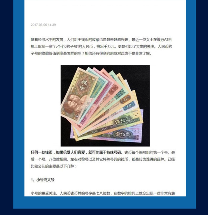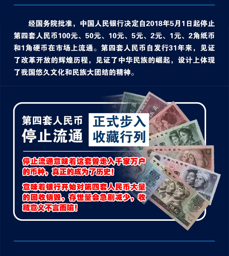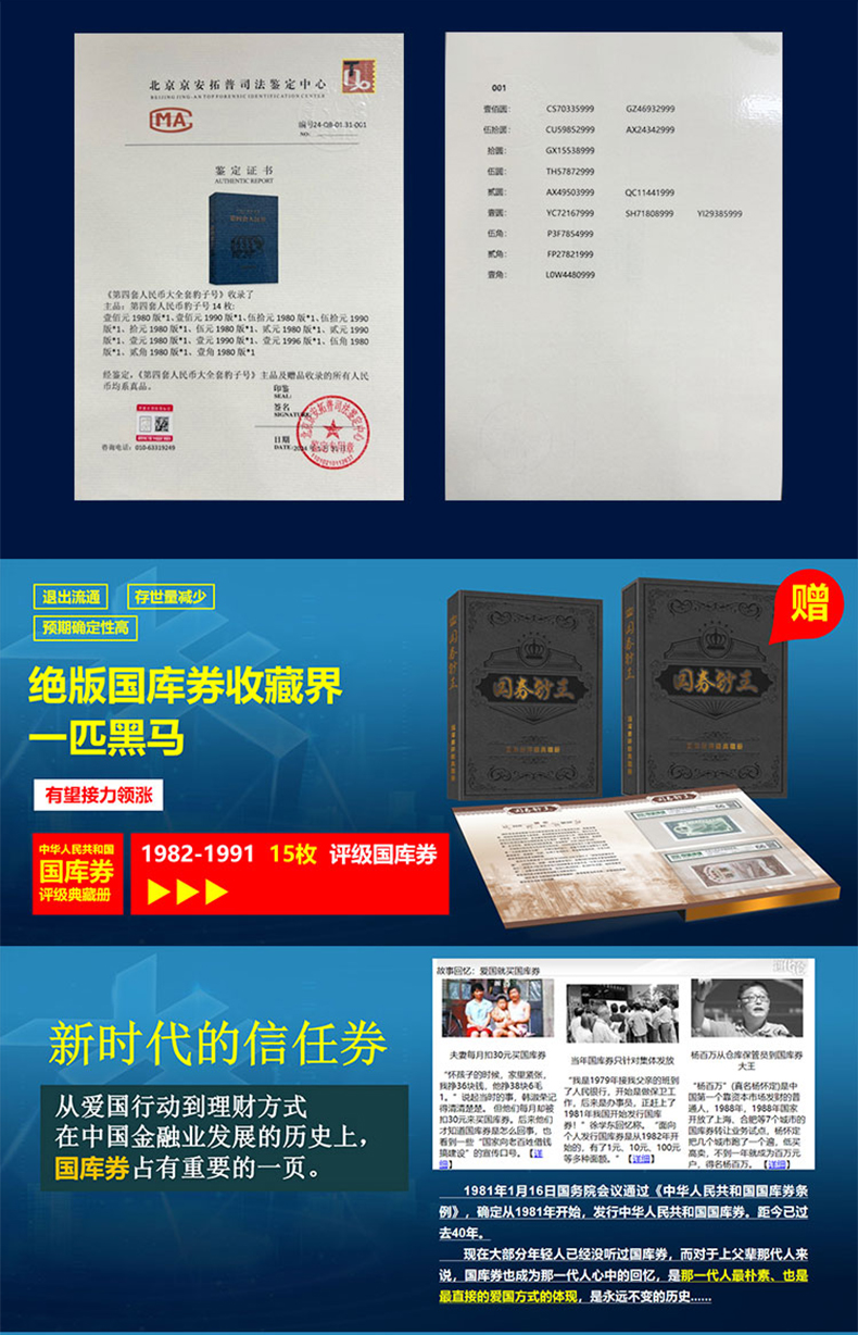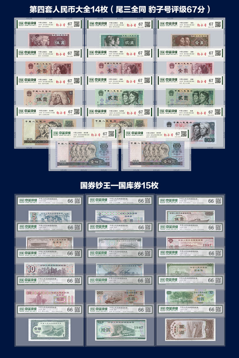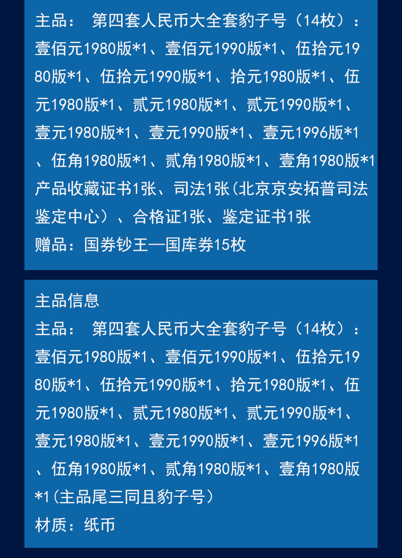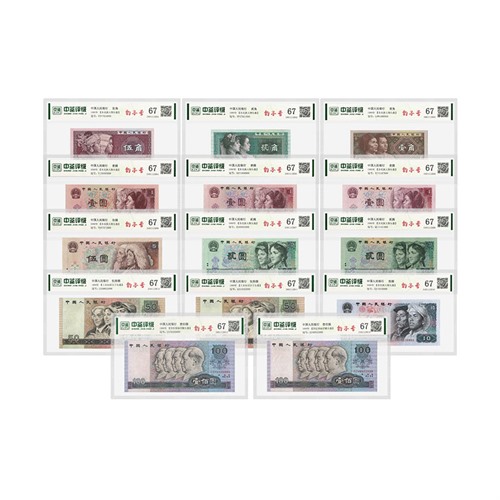 壹佰元1980版*1、壹佰元1990版*1、伍拾元1980版*1、伍拾元1990版*1、拾元1980版*1、伍元1980版*1、贰元1980版*1、贰元1990版*1、壹元1980版*1、壹元1990版*1、壹元1996版*1、伍角1980版*1、贰角1980版*1、壹角1980版*1