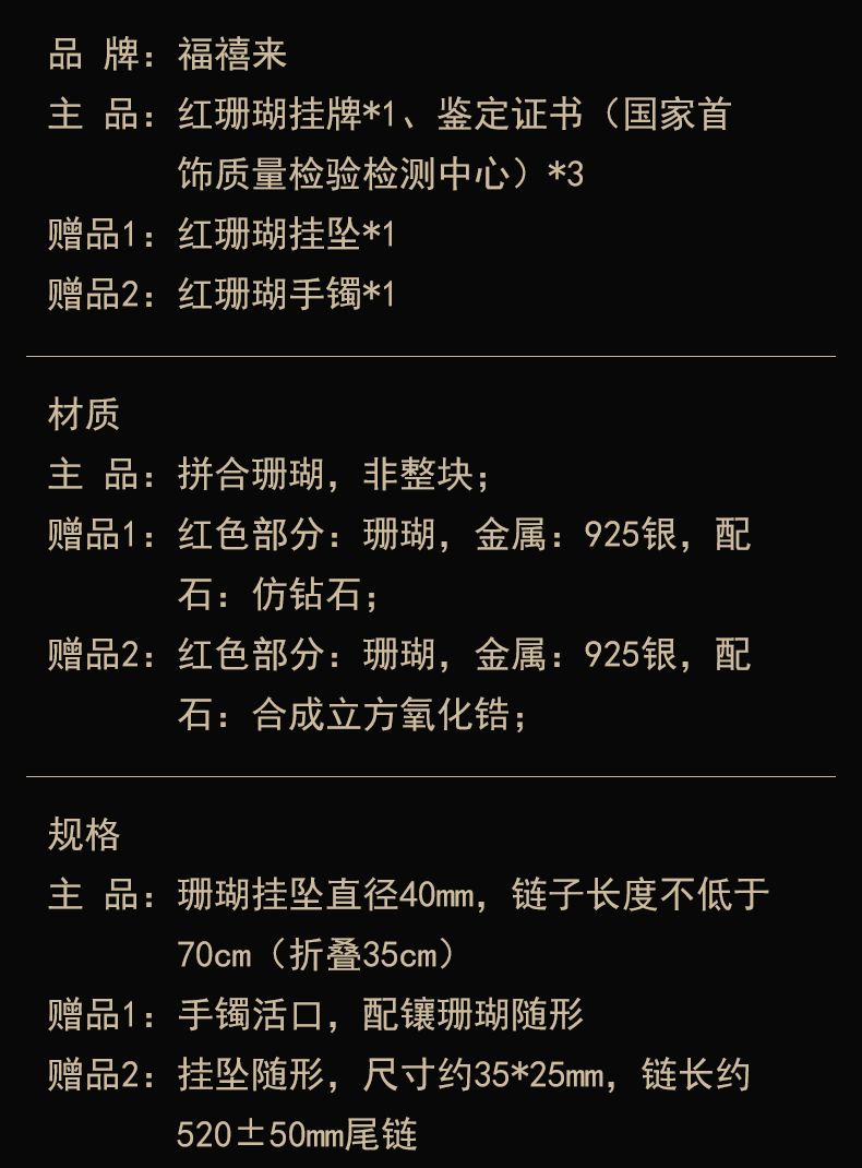 主品: 红珊瑚挂牌*1、鉴定证书(国家首饰质量检验检测中心)*3