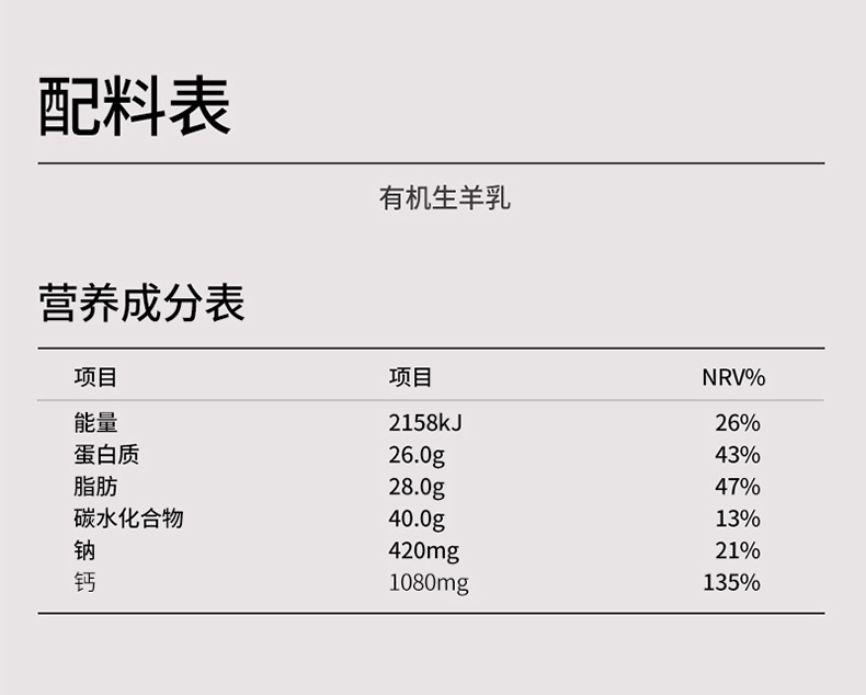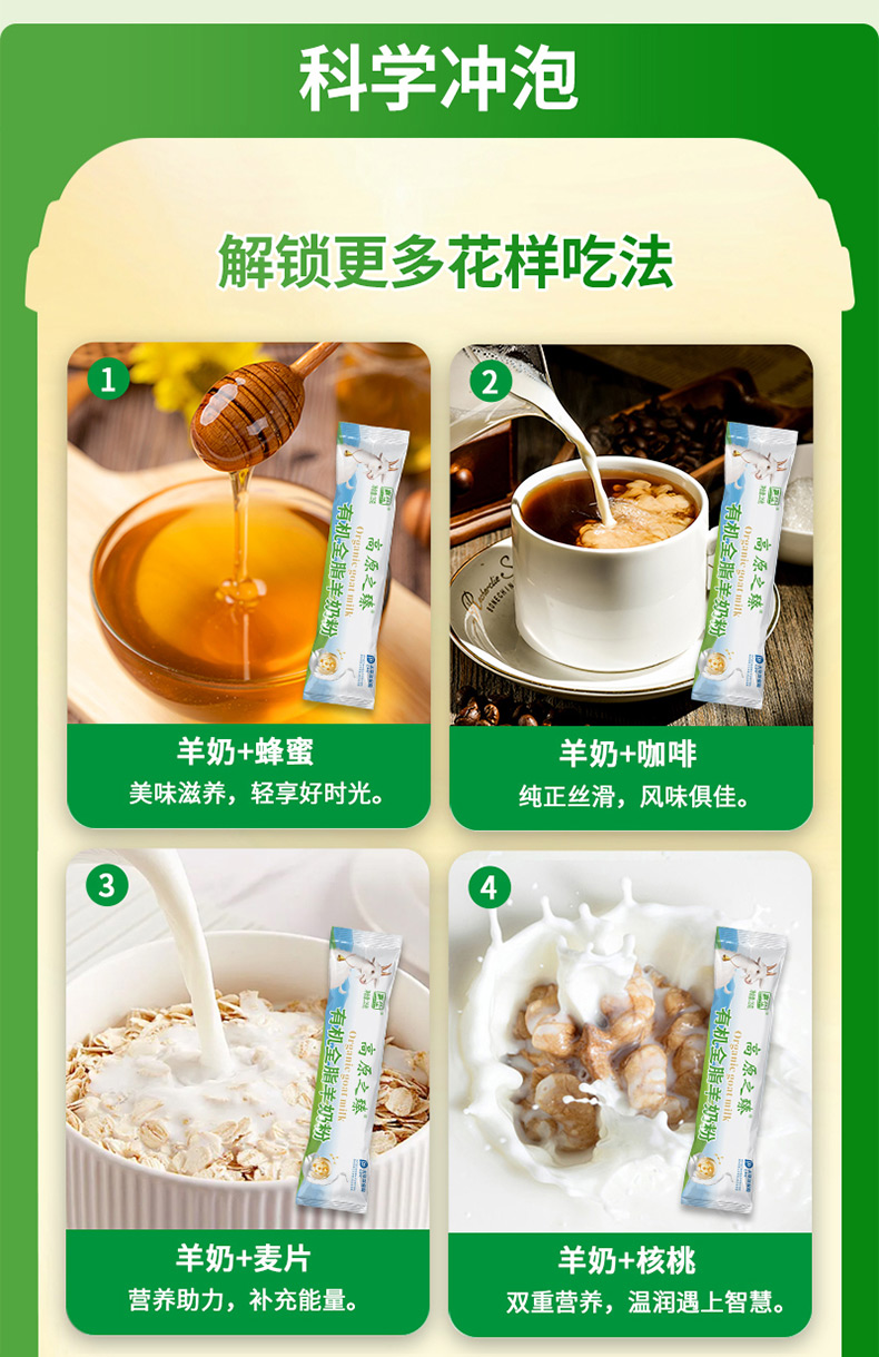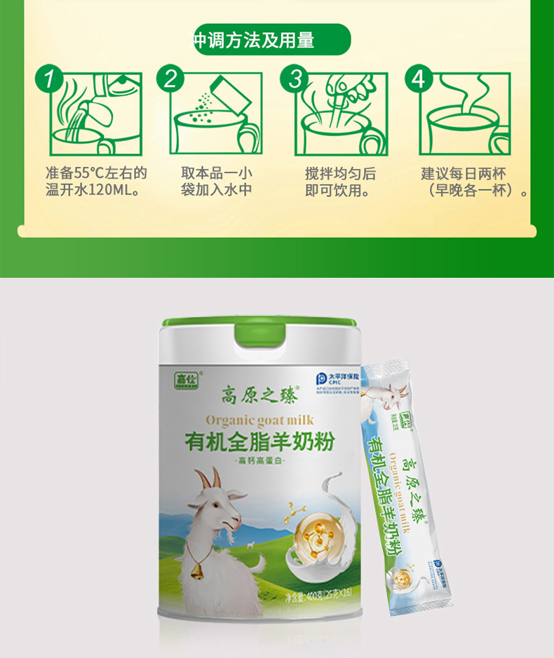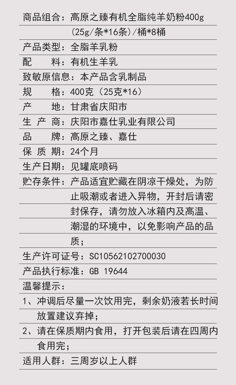 商品组合:高原之臻有机全脂纯羊奶粉400g(25g/条*16条)/桶*8桶