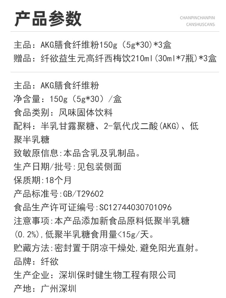 主品:AKG膳食纤维粉150g(5g*30)*3盒