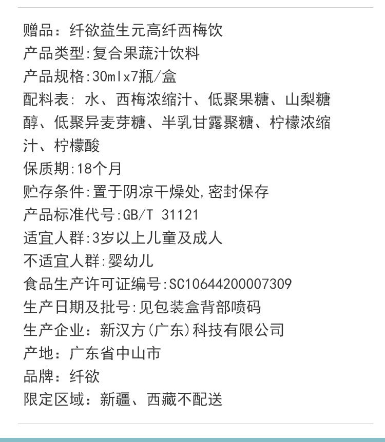 赠品:纤欲益生元高纤西梅饮210ml(30ml*7瓶)*3盒